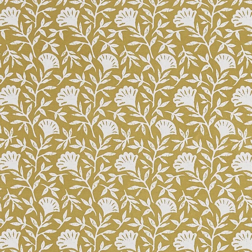 Seren Ochre Gloss Wipe Clean Oilcloth Tablecloth. A stunning wipeable oilcloth tablecloth showcasing elegant white flowers and leaves on a mustard coloured background and is an ideal choice for any dining setting. A very beautiful oilcloth design whilst being practical at the same time.  The durable oilcloth material ensures easy cleaning and long-lasting use, perfect for everyday meals or special occasions.